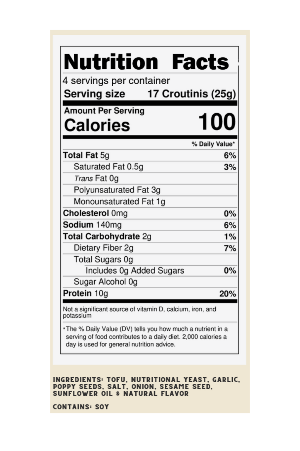 Crunch your salads or snack straight from the bag — Croutinis are a protein-packed, low-carb twist on classic croutons. Unlike traditional bread-based croutons, these are made from non-GMO soybean curds, giving you 4× more protein and 7× fewer carbs than typical croutons.