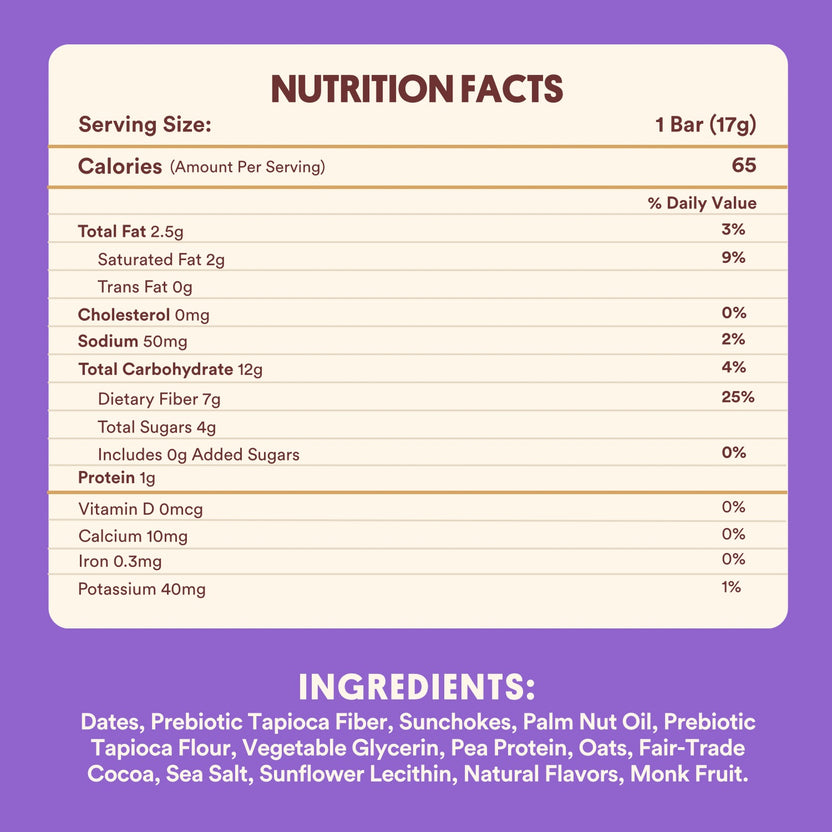 Each 3 oz bar delivers 13 grams of prebiotic fiber, 150 calories, and absolutely no added sugar, making them a smart choice for satisfying self-care, sweet cravings, or a treat in your bag. Made with ingredients like date caramel, pretzel or nuts (depending on variety), oat-milk chocolate, and other whole food or plant-based components, they bring guilt-free richness without artificial add-ons.