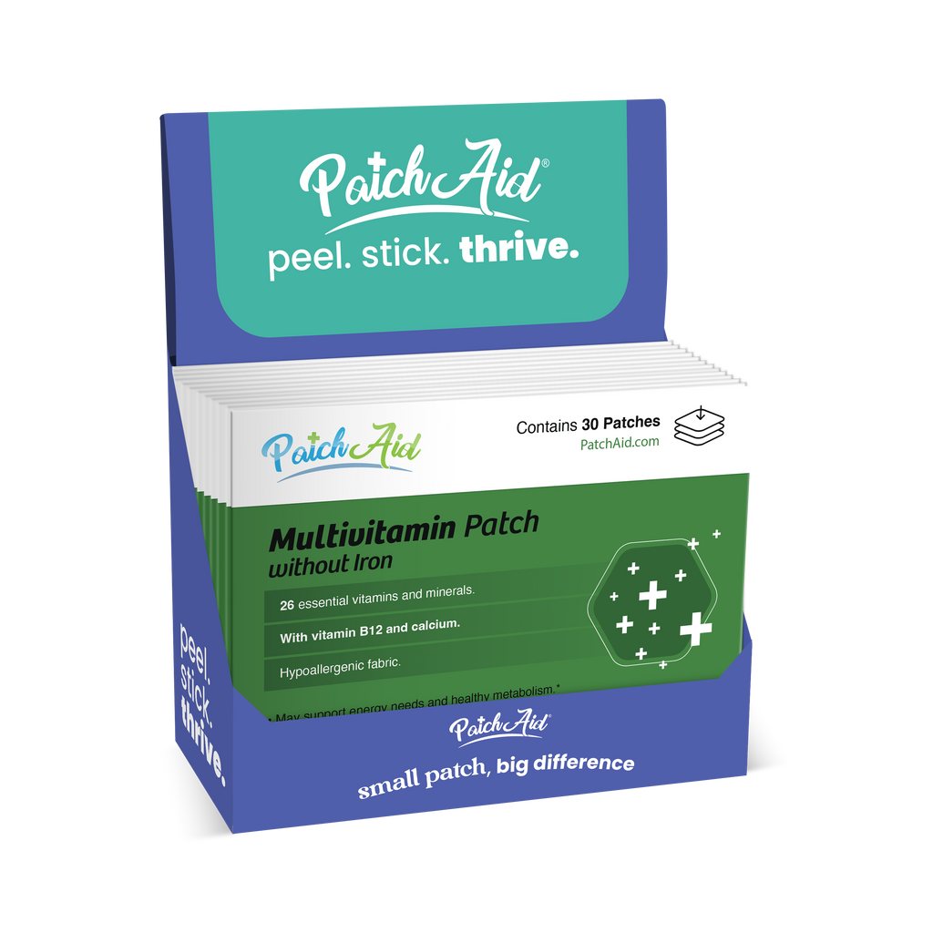 PatchAid MultiVitamin Plus Topical Patch without Iron has a unique formula with 26 essential vitamins and minerals. It is designed to contain nutrients that may not be high enough in your daily diet to provide you with optimal amounts.