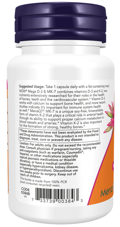 NOW® Mega D-3 & MK-7 combines vitamins D-3 and K-2, two nutrients extensively researched for their roles in the health of bones, teeth and the cardiovascular system.* Vitamin D-3 works with calcium to support bone health, and more recent studies indicate it’s important for immune system health as well.* MenaQ7® MK-7 is a unique soy-free, bioavailable form of vitamin K-2 that plays a critical role in arterial health through its ability to support proper calcium metabolism in blood vessels and arteries.* Vitamin K-2 is also important for the formation of strong, healthy bones.*