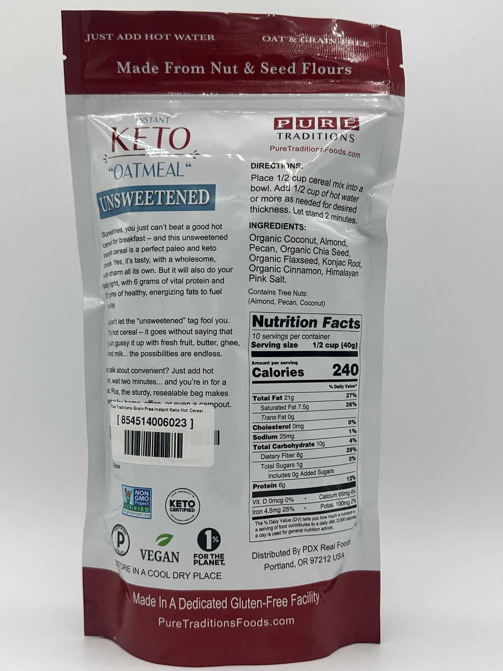 Pure Traditions Instant Hot Cereal is an unsweetened "oatmeal" that tastes great as is but you can add your favorite toppings such as fresh fruit, butter, ghee, and almond milk. Wholesome and nutty, Pure Traditions Gluten and Grain Free Instant Hot Cereal contains protein, good-for-you fats, and is low in carbs. Just add hot water, let it stand a couple minutes, and you're in for a treat. Made from nut and seed flours, this oat free, oatmeal alternative comes in a sturdy, resealable bag.