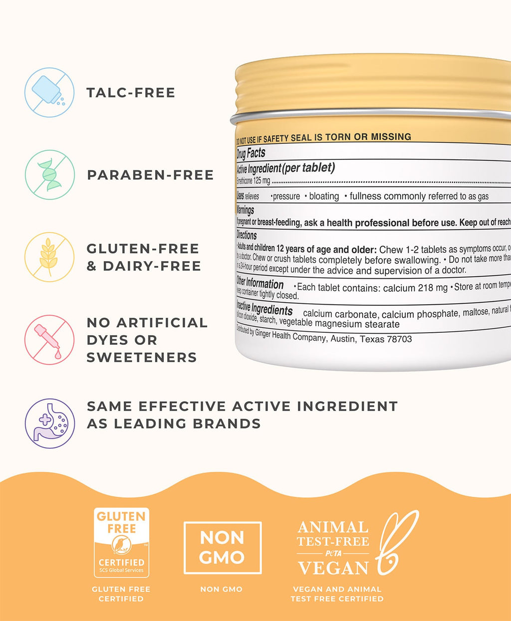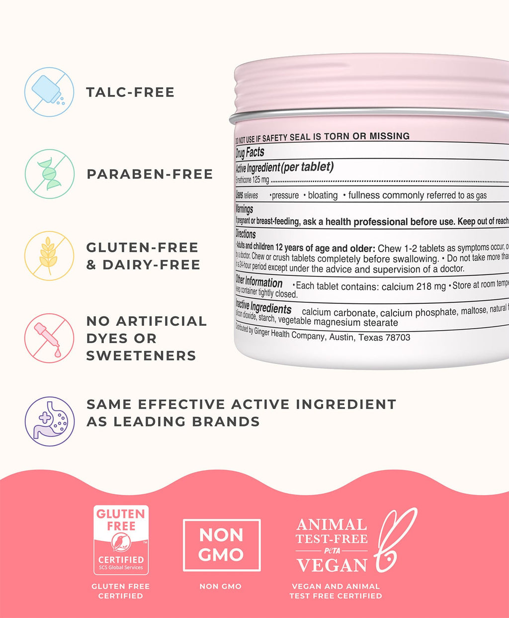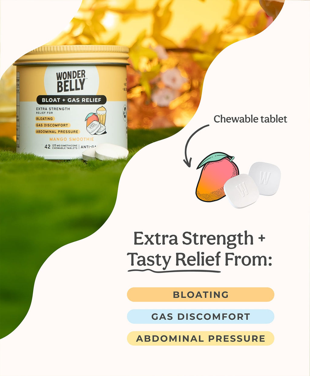 Bloating happens. Gas pressure happens. Wonderbelly makes it easier to feel like yourself again, fast. Wonderbelly Bloat + Gas Relief is an extra-strength chewable that helps relieve bloating, gas discomfort, fullness, and abdominal pressure using 125 mg simethicone per tablet, the same active ingredient used by leading anti-gas brands.
